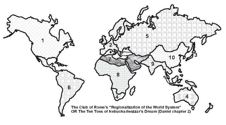 “On page 38, figure 4-1 of “Mankind at the Turning Point” there is a map which shows the world divided into ten regions. Appendix II identifies these regions as: 1. North America, 2. Western Europe, 3. Japan, 4. Rest of the Developed Market Economies (including Israel, Australia and South Africa), 5. Eastern Europe including the Soviet Union, 6. Latin America, 7. North Africa and the Middle East, 8. Main Africa, 9. South and Southeast Asia, 10. Centrally Planned Asia. This is the embryonic form of the ten toes of Nebuchadnezzar’s vision. Already there have been changes, as we have seen Mexico being included in NAFTA, whereas it was originally included in the Latin American region. Originally Africa had been divided into three regions, but the African Union, formed on 9 July 2002, has taken in almost all of Africa, with the one exception currently being Morocco.” (The Spirit of Prophecy, by Daniel Knezacek, page 58)